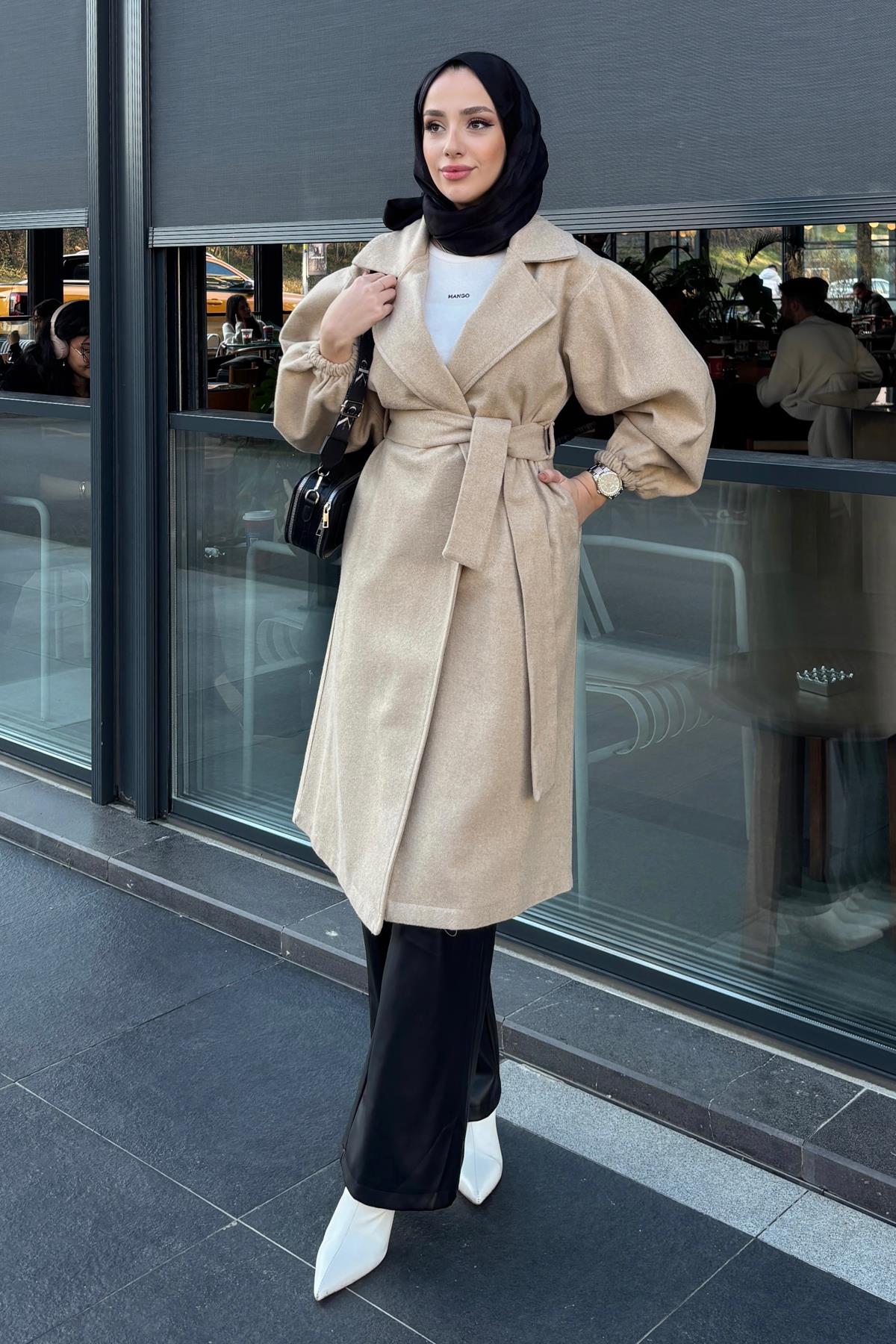 Yeni sezon kaşe kabanımızın bilekleri lastiklidir. Beli kuşaklı olan kabanımıızn iki adet kemer köprüsü bulunmaktadır. Düşük omuz model olan kaban düğmesizdir. Yanlarında iki adet gizli cebi vardır. İçi astarsızdır.